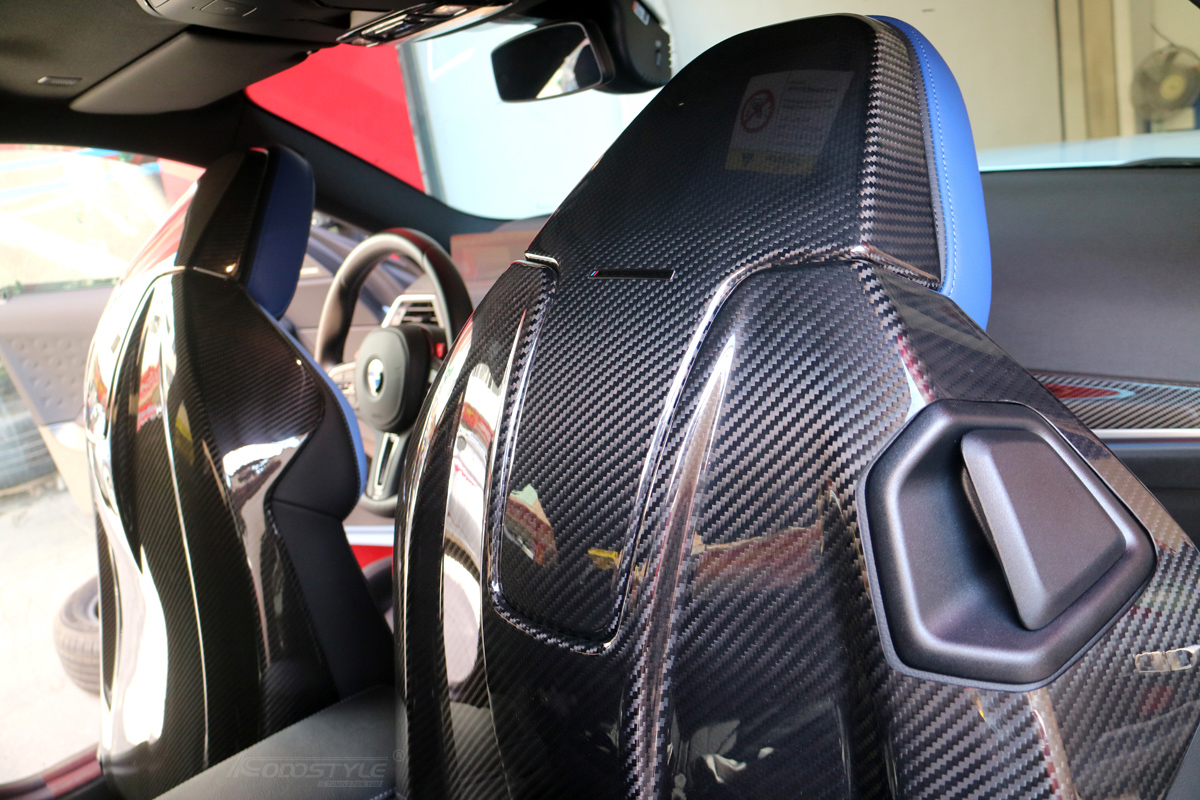 G8X M (original sports seats) actual vehicle modification with dry carbon fiber seat back panel (head and large backrest) and dry carbon fiber seat side panel